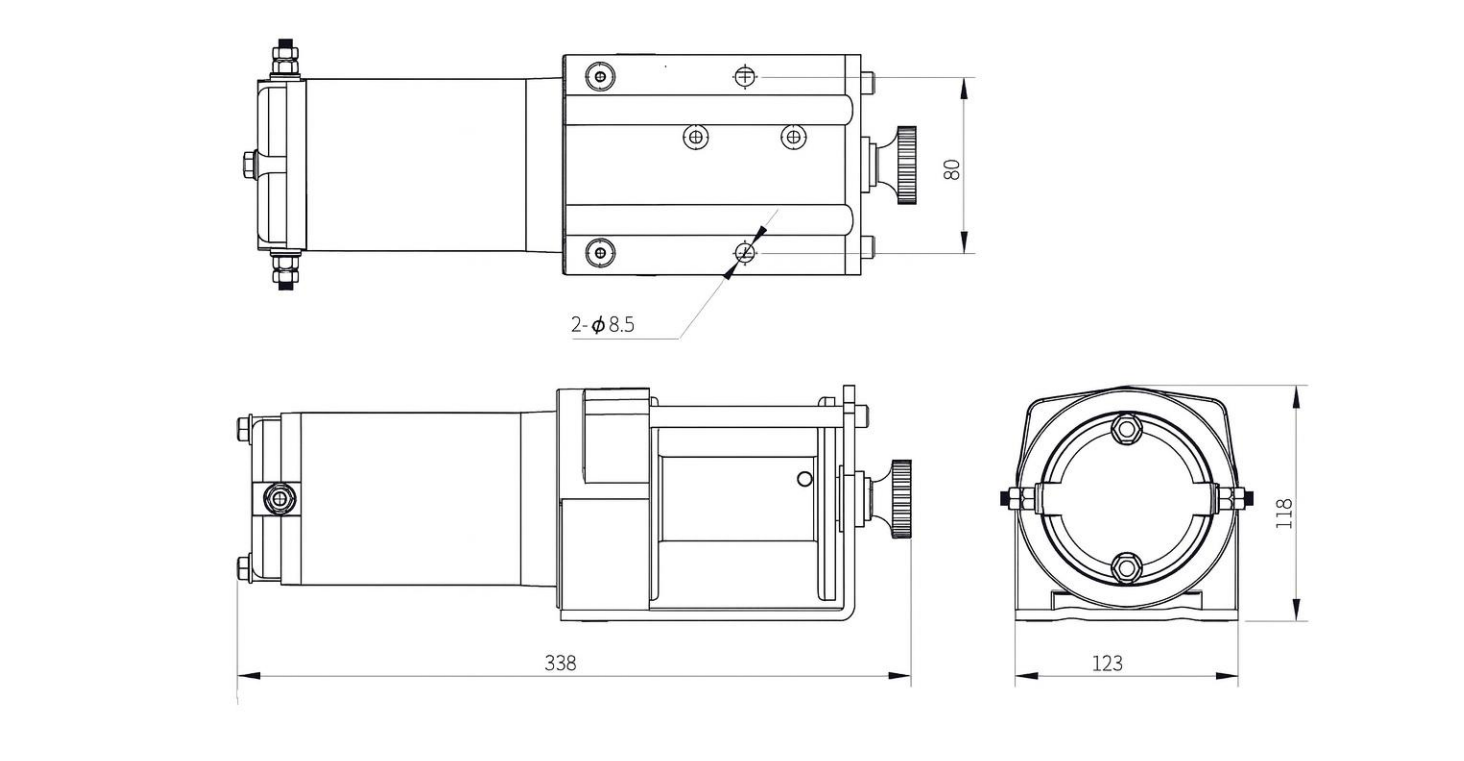 El cabrestante funciona con una fuente de alimentación de 12 V CC y alcanza una fuerza de tracción nominal de hasta 1130 kg (2500 lbs) en la primera capa de la cuerda de acero. A medida que aumenta el número de capas de cuerda en el tambor, la fuerza de tracción disponible disminuye gradualmente, lo cual es característico de todos los cabrestantes de tipo tambor.