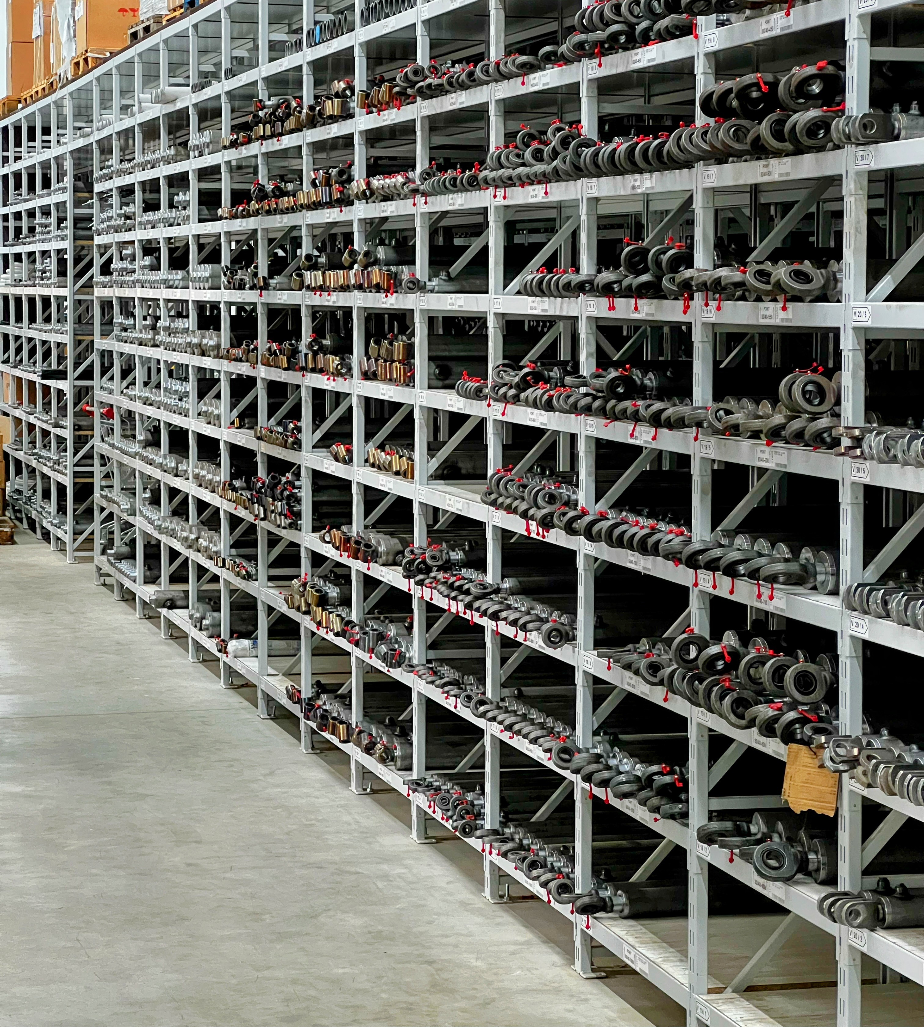 Per i piccoli componenti utilizziamo un “magazzino intelligente” (Modula). Gli articoli sono organizzati per codice in vassoi con molti scomparti. Inserendo un codice sullo schermo, il sistema consegna in pochi secondi il vassoio corretto e indica lo scomparto con un laser. Il sistema è integrato con l’inventario, quindi le giacenze restano sempre aggiornate. Questo è particolarmente utile per i raccordi, poiché ogni giorno assembliamo molti tubi idraulici personalizzati con connettori diversi alle estremità.