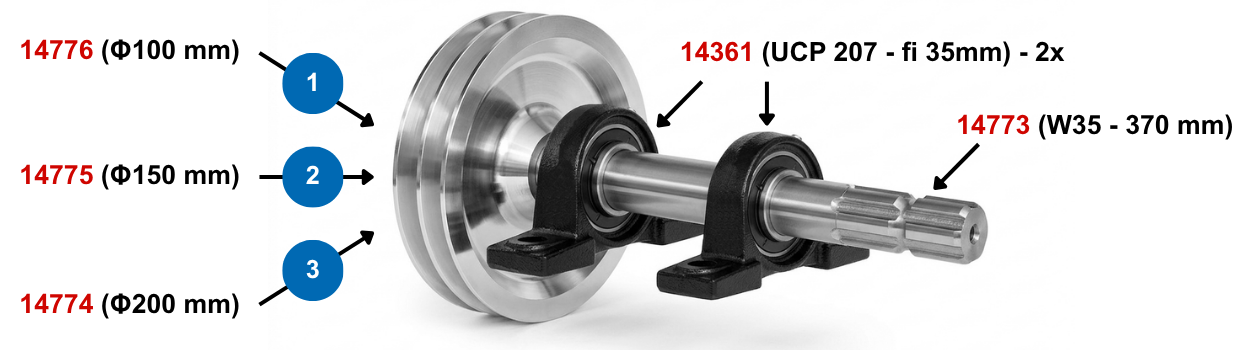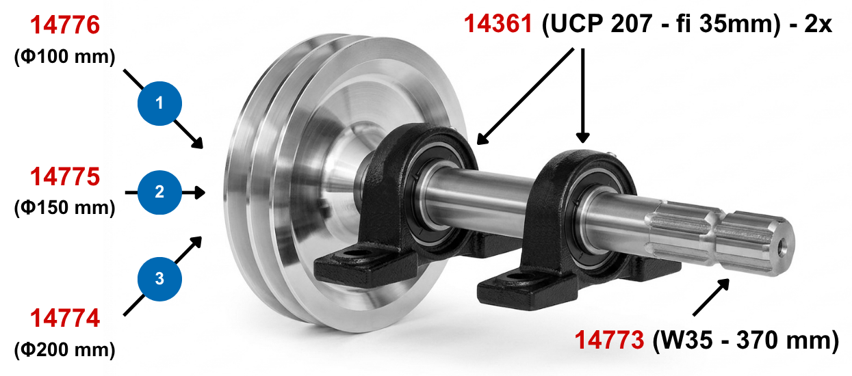 Puedes montar un conjunto de eje con polea según tus necesidades: