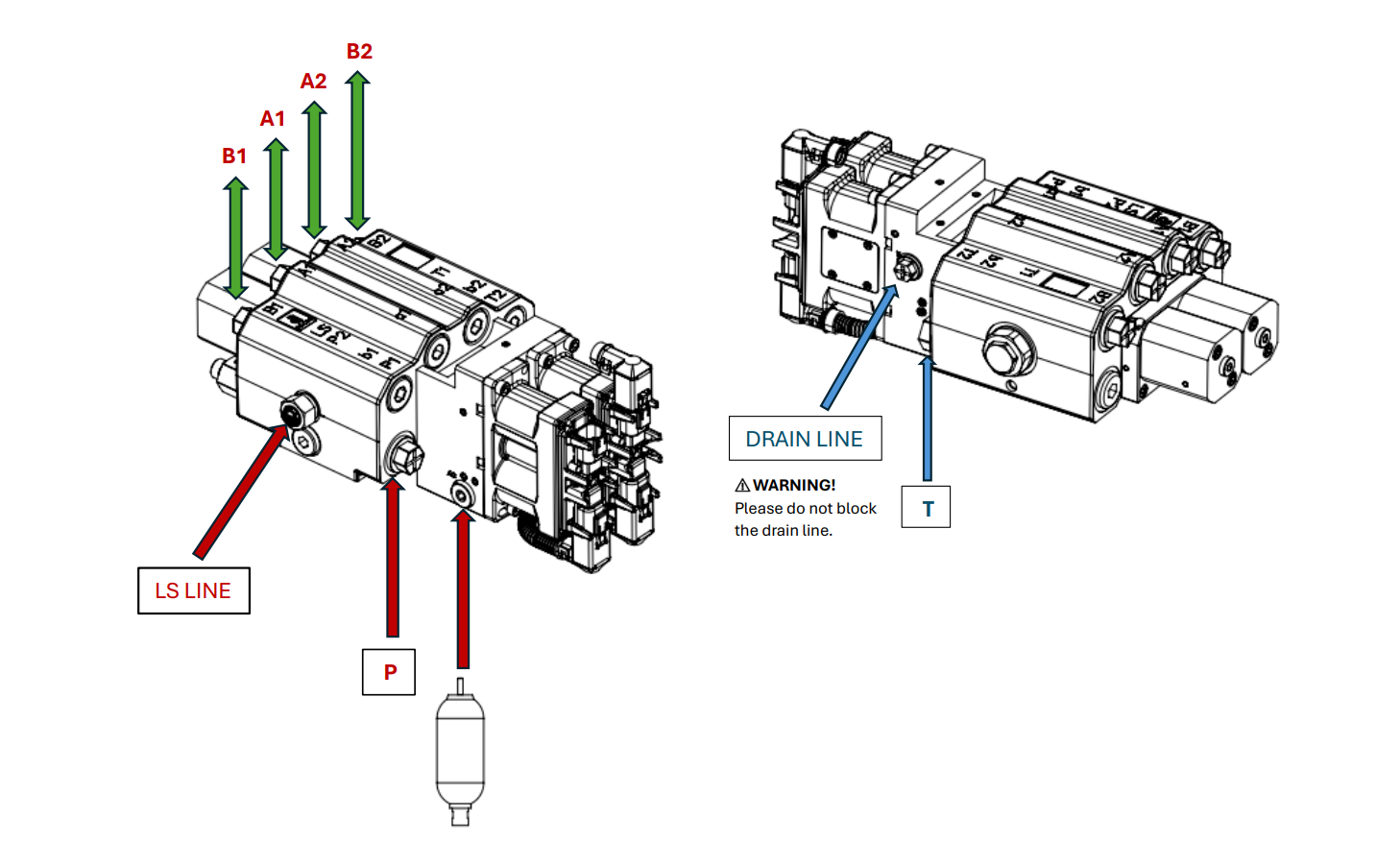 - Zkontrolujte, zda jsou linie T (nádrž) a P (tlak) správně připojeny a fungují.