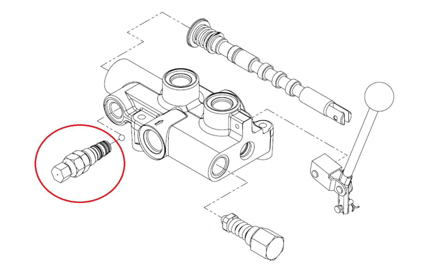 Tlačni izključitveni pin omogoča tlačni izključitveni sistem (izmet ročice v nevtralno pozicijo). Ko se vreteno pomakne v tlačni izključitveni sistem je olje preusmerjeno v "B" delovni port (vstran od ročice). Ko tlak v portu “B” preseže nastavljeno vrednost, tlačni izključitveni pin sprosti krmilno ročico v nevtralno pozicijo. Tovarniška nastavitev je 70 bar. Tlačni izključitveni pin je nastavljiv tako, da odvijete matico (4), zavrtite nastavitveni vijak (5) in sicer v smeri urinega kazalca, se bo povečal pritisk na tlačnem izključitvenem pinu in nasprotni smeri pa se bo pritisk zmanjšal.